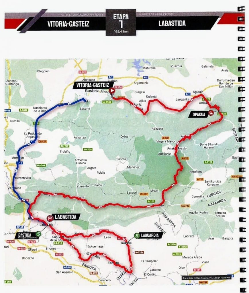 La ronda vasca, que llegará a Labastida mañana lunes 3 de abril, saldrá de la capital alavesa a las 13,21 horas, para alcanzar Bernedo en torno a las 15,04 horas, continuar por Villafría, Lagrán, Peñacerrada y salir a Salinillas de Buradón a las 15,55 horas. Esta primera etapa se adentrará en carreteras riojanas para retomar de nuevo Labastida donde se llevará a cabo un sprint especial al paso por contrameta a las 16:07 horas y acto seguido discurrir por las localidades de San Vicente de la Sonsierra, Baños de Ebro. Elciego, LaPuebla de Labarca, Laguardia donde hay previsto un sprint Samaniego y ya de regreso a través de Ábalos, volver y llegar a Labastida dónde estará instalada la meta sobre las 17,30 horas.