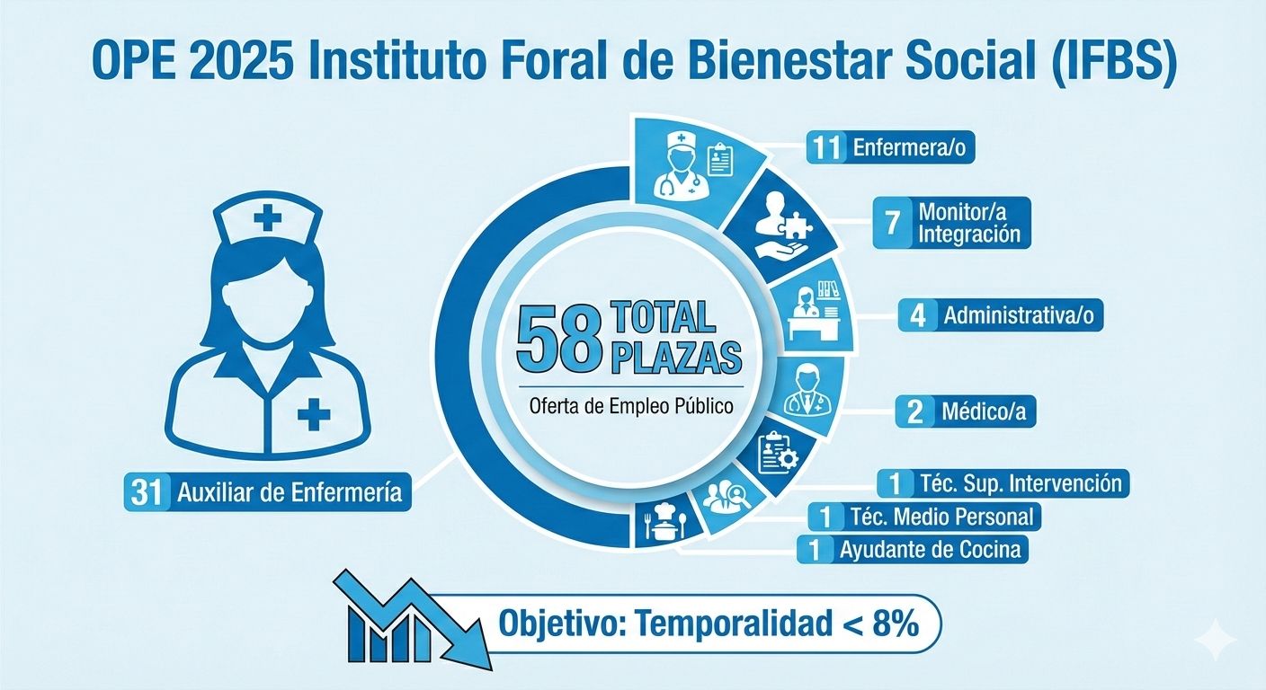 El Consejo de Gobierno Foral aprobada esta semana la Oferta de Empleo Público (OPE) 2025 del Instituto Foral de Bienestar Social (IFBS), que contempla un total de 58 plazas de personal funcionario repartidas en ocho categorías profesionales. Esta iniciativa persigue renovar la plantilla, estabilizar el empleo y situar la tasa de temporalidad por debajo del 8%, aprovechando al máximo la tasa de reposición permitida por la normativa vigente.
