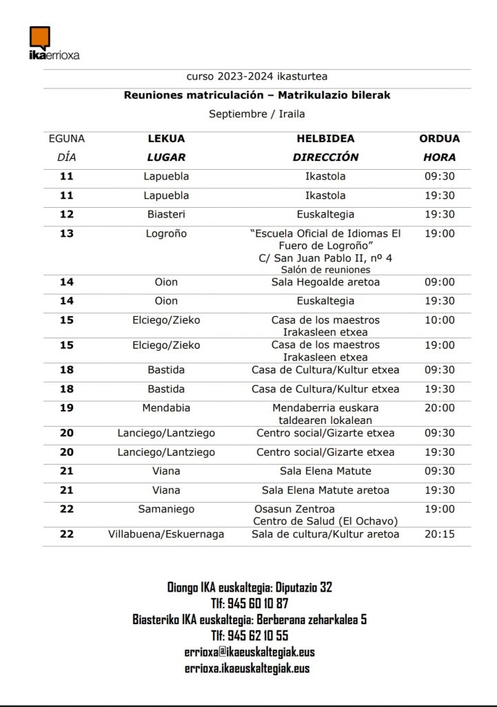 El euskaltegi IKA, con centros en Oion y Laguardia, va a iniciar en breve la inscripción para el curso 2023/24, desde el 1 hasta el 22 de septiembre. Durante el periodo del 11 al 22 de septiembre, profesores de IkaErrioxa visitarán diferentes localidades para presentar los métodos de enseñanza, administrar las pruebas de nivel y recopilar los horarios preferidos de los interesados.