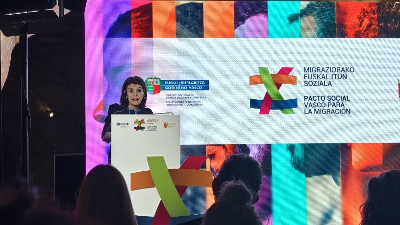 Durante el acto, la consejera de Bienestar, Juventud y Reto Demográfico, Nerea Melgosa, destacó que “en un contexto internacional donde la migración ocupa cada vez más y mayores titulares, en Euskadi nos hemos acercado hasta la muga, hasta la frontera, para reivindicar una gobernanza de la migración basada en el respeto a los Derechos Humanos, en la solidaridad y la corresponsabilidad, pero sobre todo en la colaboración.