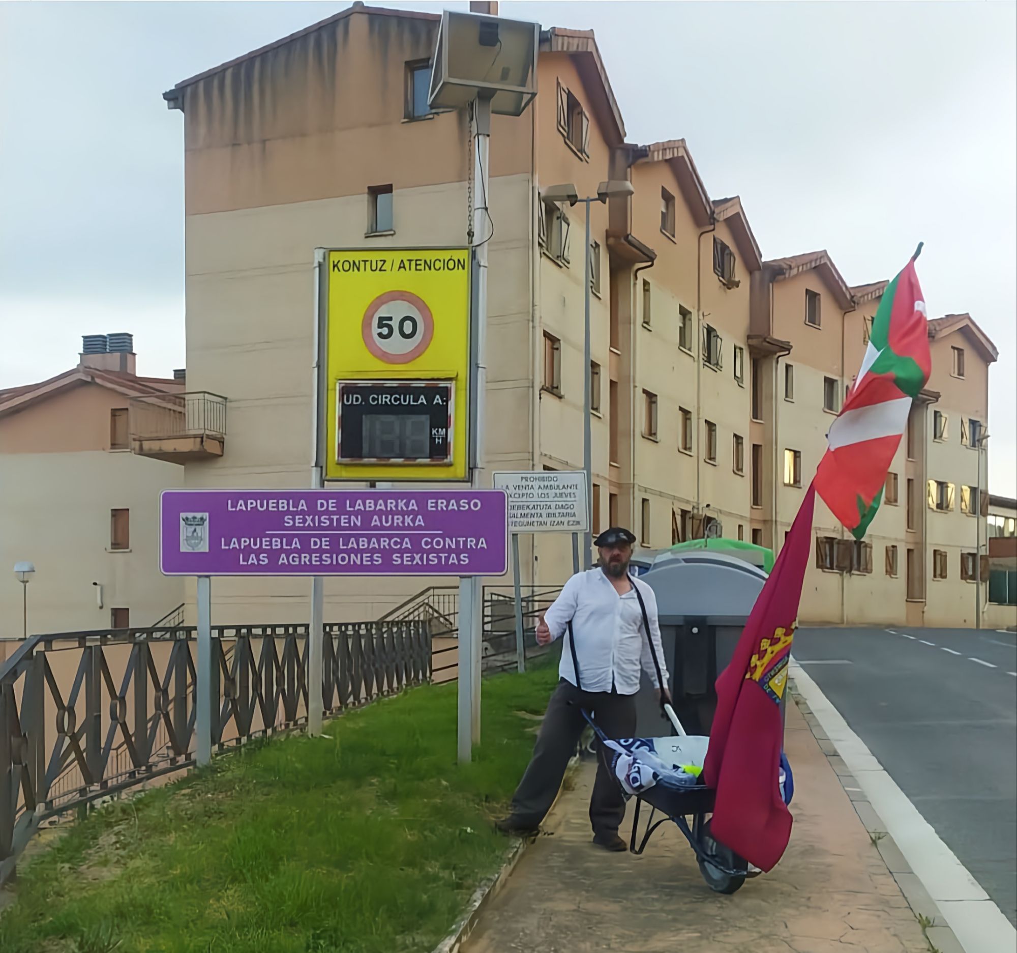 Un auténtico embajador simpático que eso sí de una manera muy vistosa consigue que con quienes se tope se acaben dando la vuelta para corroborar y comprobar que efectivamente han visto a un hombre vestido de aldeano con una carretilla llena de productos y con unas vistosas banderas entre ellas una ikurriña al tiempo que empuja.