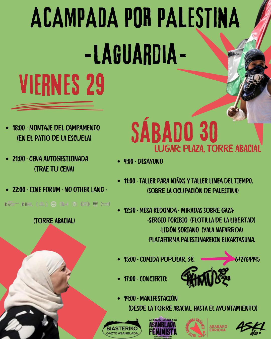 Diversos colectivos de nuestra comarca, entre ellos Biasteriko Gazte Asanblada, Asamblea de Mujeres de Araba, Arabako Errioxa y Aski da!, han convocado una acampada en solidaridad con Palestina para los próximos 29 y 30 de agosto. Esta iniciativa, que denuncia el conflicto en Gaza y busca visibilizar la resistencia del pueblo palestino, incluirá actividades culturales y de reflexión en el corazón de Laguardia.