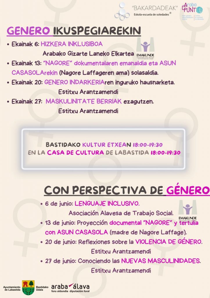 Las últimas dos sesiones, los últimos dos jueves de junio, estarán a cargo de Estitxu Arantzamendi. Ella hablará sobre la violencia de género, explicando los diferentes tipos de violencia, los recursos disponibles para las víctimas, cómo identificar la violencia y por qué es difícil para las víctimas salir de la red de maltratos.