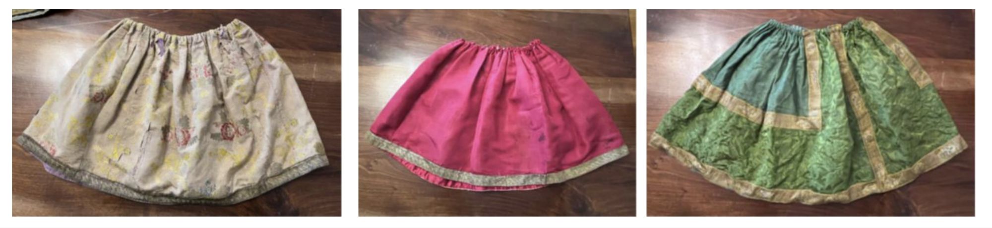 El proyecto promovido por el Ayuntamiento de Elciego, con una inversión total de 2.226,40 €, se centra en la restauración de varias piezas de indumentaria tradicional, concretamente tres faldillas pertenecientes a trajes regionales vinculados a la danza. Todas están confeccionadas en tejido de damasco y rematadas perimetralmente con galones dorados. Las piezas presentan diversos deterioros, entre los que destacan suciedad superficial, pliegues, intervenciones antiguas, manchas, desgarros y desgaste general debido al uso.