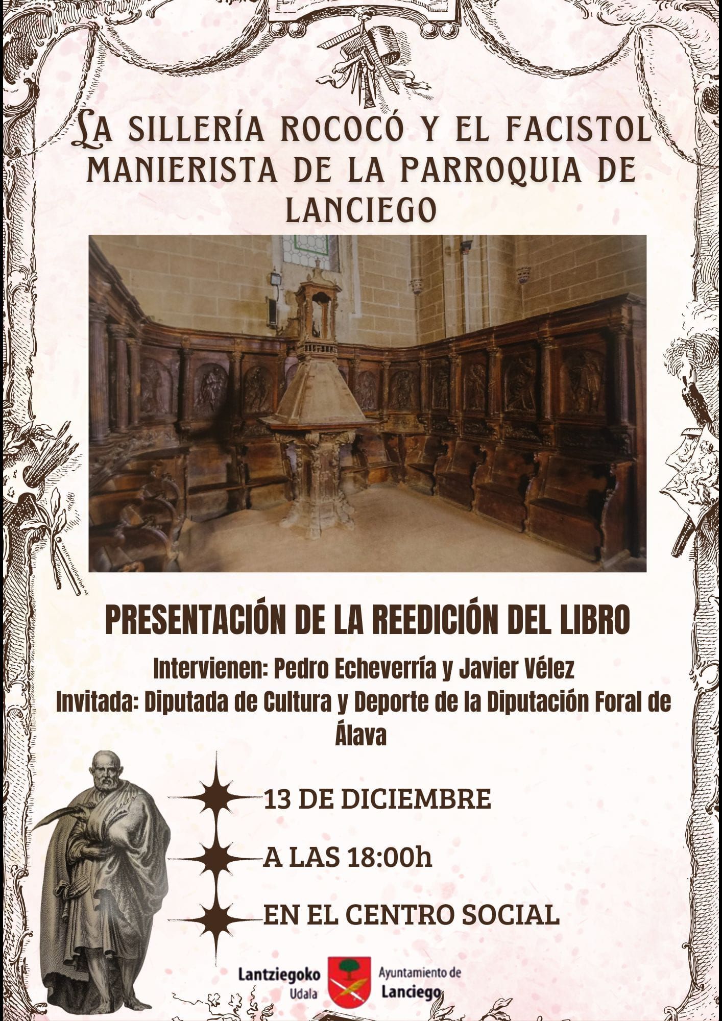 Lanciego vuelve a tener en sus manos un patrimonio que muchos daban por perdido. Este sábado 13, a partir de las 18:00 en el Centro Social de la localidad, se presenta la reedición del estudio La sillería rococó y el facistol manierista de la parroquia de Lanciego. Sus fuentes gráficas, una obra que analiza en profundidad dos piezas de un patrimonio artístico cuya relevancia trasciende lo local y que puede considerarse destacado dentro del País Vasco, así como sus conexiones con repertorios europeos de los siglos XVI y XVIII, que ayudan a entender su relación con modelos artísticos difundidos por toda Europa.