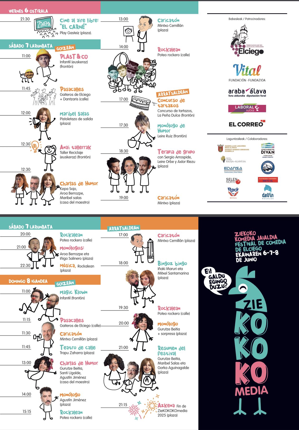 El festival tendrá un montón de planes: charlas sobre humor, improvisaciones, caricaturas en vivo con Mintxo Cemillán, un concurso de tartazos, teatro callejero y actividades para los peques. Los monólogos asegurarán risas, y el cine al aire libre será un planazo. Además, la música animará las calles con los Gaiteros de Elciego, Dantzaris y Rockalean.