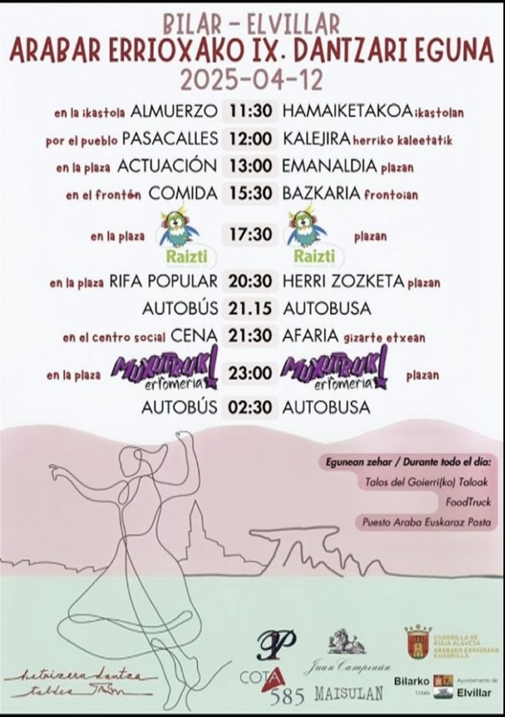Tras una comida popular para los dantzaris, hay anunciada una dantza plaza, una rifa popular y una romerÃa, «porque uno de los objetivos de este Dantzari Eguna es impulsar el euskera en el pueblo», se señala este grupo de danzas de ElVillar.