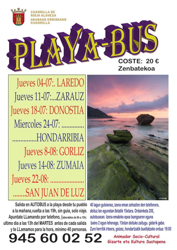 Sea como fuere y esperando a conocer las fechas de apertura del resto de nuestras piscinas de la comarca que presumiblemente será en alguna de las dos fechas antes señaladas, la Cuadrilla de Rioja Alavesa a través del Servicio de animación sociocultural ha programado el tradicional Playa Bus que durante los meses de Julio y de agosto viajará hasta el litoral cantábrico y que permitirá a muchos de nuestros vecinos el poder disfrutar de un buen dÃa de sol y de playa.
