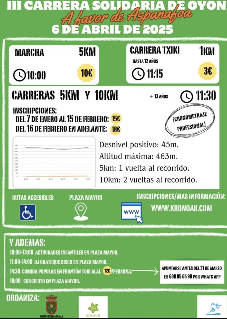 Todavía está abierto el plazo de inscripción hasta el 31 de marzo para todas aquellas personas que quieran participar en la carrera solidaria organizada por el Ayuntamiento de Oion, que se celebrará el próximo domingo 6 de abril y contará con diferentes modalidades. El objetivo de la carrera es recaudar fondos, ya que cada año se destina a una asociación distinta y por una buena causa. En esta ocasión, los fondos recaudados se destinarán a ASPAFANOA, una asociación alavesa que lucha contra el cáncer infantil y brinda apoyo a los niños y sus familias durante todo el proceso de la enfermedad.