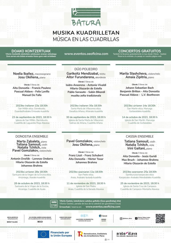 El ciclo «Música en las Cuadrillas: Batura» tiene como objetivo destacado valorizar la música vasca durante los meses de septiembre a noviembre. Este evento cuenta con intérpretes tanto vascos como internacionales y es patrocinado por la DFA. Ha nacido con un triple objetivo, según aseguraron sus responsables en una rueda de prensa de presentación esta misma semana: difundir la música clásica vasca, impulsar la programación cultural en el medio rural y descubrir el patrimonio de los pueblos alaveses.
