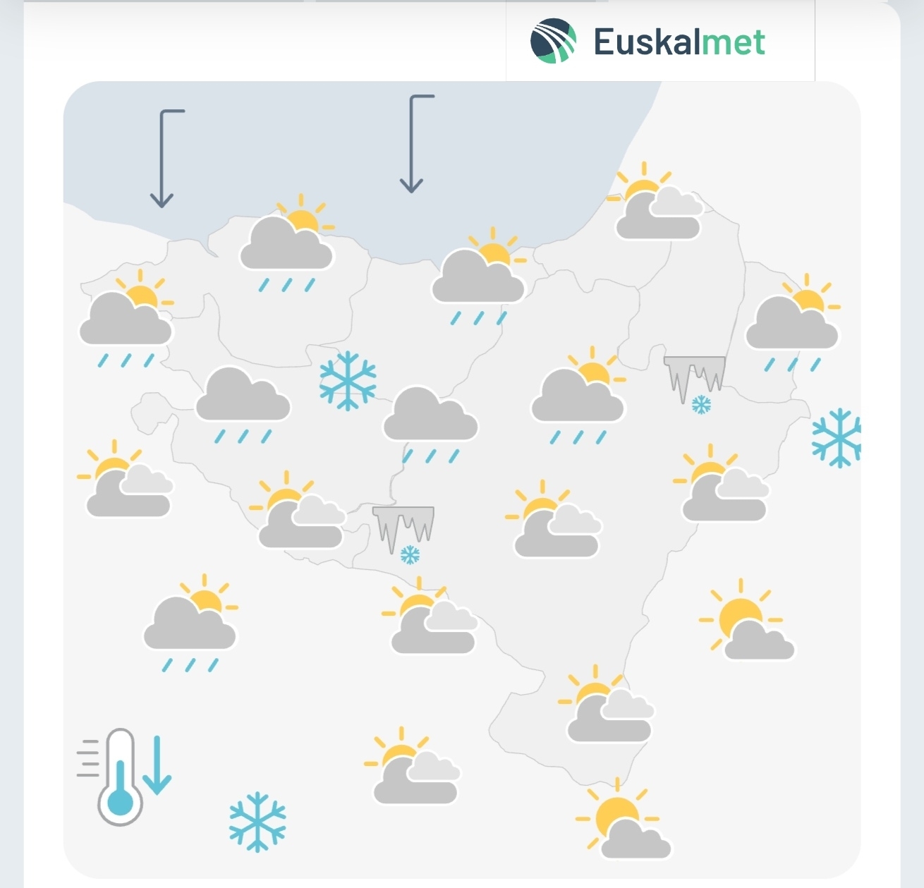 La cota de nieve se situará en torno a 700-800 m, subiendo durante las horas centrales del día a 800-900 m. Los espesores previstos son de 5-30 cm a 1000 m. Según Euskalmet, la situación empeorará mañana domingo. El lunes habrá menos precipitaciones, pero llegará aire frío que hará descender los termómetros.