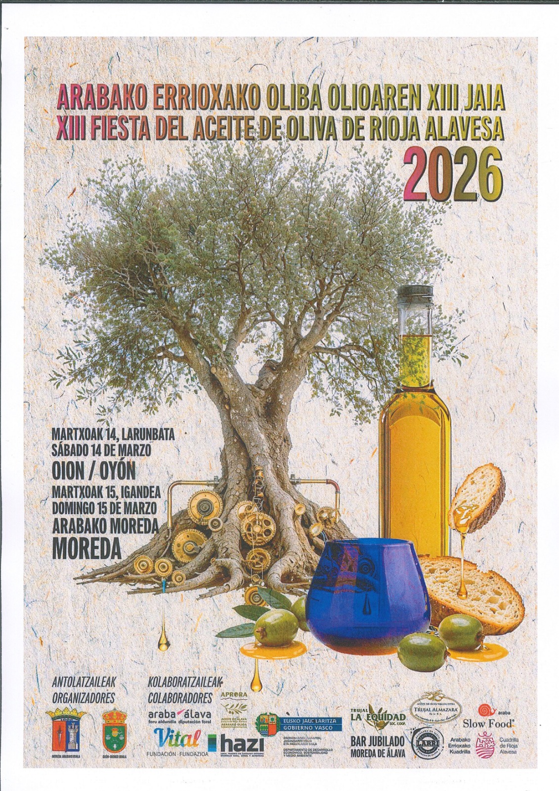 La jornada del sábado 14 de marzo se celebrará en Oion y arrancará con la apertura del trujal Almazarra (carretera de Laguardia nº 6-8), que permanecerá abierto de 9:30 a 13:30 y de 16:00 a 19:30 horas para la venta directa de aceite. Por la tarde, a las 17:30 horas, la Asociación de Productores y Productoras de Aceite de Rioja Alavesa (APRORA) ofrecerá una cata comentada en la sala polivalente de la Plaza de la Concepción, una actividad con plazas limitadas que requiere inscripción previa en el Ayuntamiento.