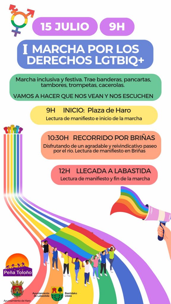 La Asociación de Mujeres Peña Toloño de Labastida ha organizado la I Marcha por los derechos del colectivo LGTBIQ+, que tendrá lugar el próximo sábado 15 de julio. La marcha comenzará a las 9:00 de la mañana en la plaza de la Paz de Haro y terminará en la plaza de la Paz de Labastida, pasando por Briñas.