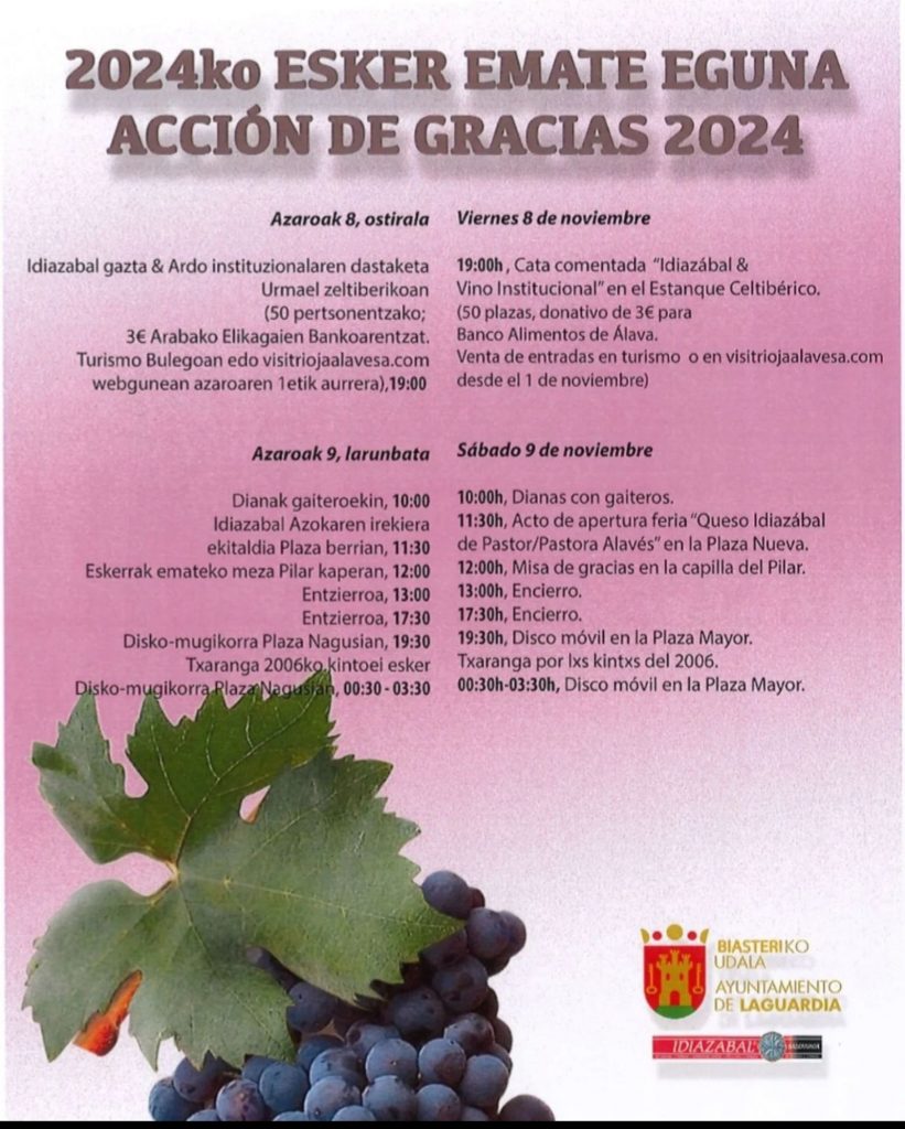 Una primera jornada que dará paso a la feria propiamente dicha el sábado, día 9 de noviembre, en la Plaza Nueva a lo largo de toda la mañana. Se celebrará una jornada festiva con motivo de la celebración de las fiestas de Acción de Gracias, que, como no puede ser de otra manera, se iniciará con dianas a cargo de los gaiteros de la localidad, y la celebración de dos encierros de reses bravas, una de las señas de identidad de Laguardia, en horario de mañana y tarde. El programa se completará con una discoteca móvil y la presencia por sus calles de una txaranga a cargo de los quintos del 2006.