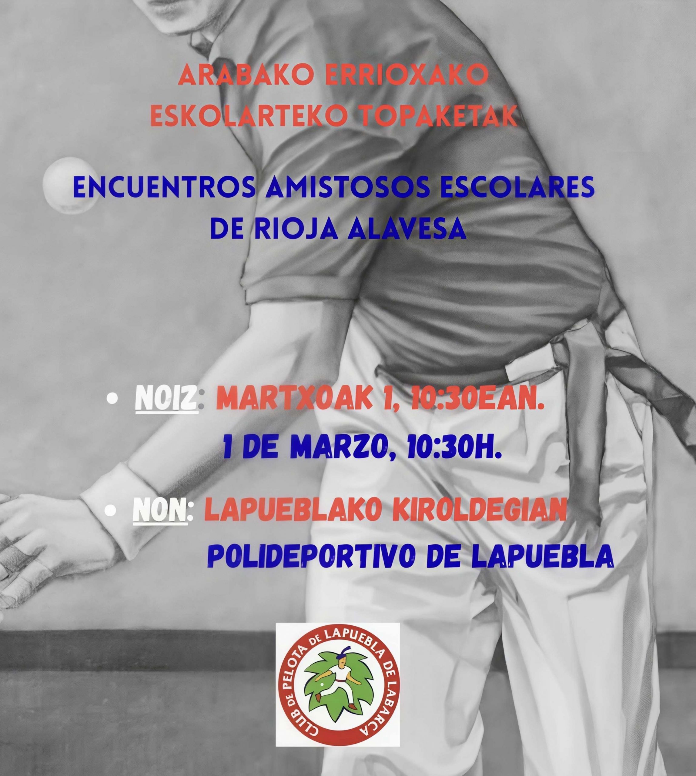 Para este año están previstos tres encuentros mensuales, uno por cada escuela de pelota, en Lapuebla de Labarca, Oion- y Laguardia a los que podrĂa sumarse un cuarto aĂşn pendiente de confirmaciĂłn. El primero de ellos se celebrará este domingo, 1 de marzo, en Lapu6 de Labarca El segundo tendrá lugar el 15 de marzo en Laguardia.