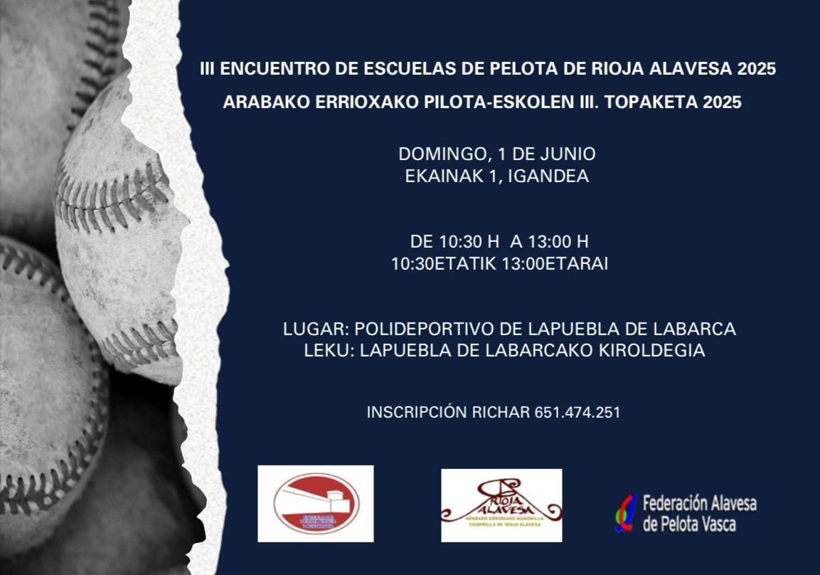 Este próximo domingo, 1 de junio, Lapuebla de Labarca acogerá la tercera edición del encuentro de las escuelas de pelota de Rioja Alavesa. Este evento reunirá a las tres escuelas de la zona, ubicadas en Oión, Laguardia y la propia Lapuebla de Labarca, con la participación esperada hasta la fecha de de 41 niños y niñas de entre 6 y 13 años, tanto federados como no federados. De ellos, 13 proceden de Lapuebla de Labarca, 22 de Laguardia, 4 de Oión y 2 de Labastida.