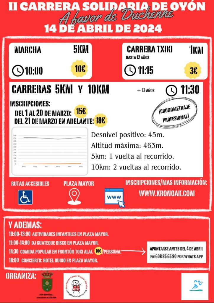 La carrera/marcha solidaria de Oion se caracteriza, sobre todo, por ser un terreno muy llano, con muy poco desnivel, tan solo 45 m; y transcurre tanto por las calles de la localidad como por zonas verdes, como el parque Arroyo Grande, asà como por caminos embreados entre viñas. Este evento cuenta con 4 modalidades, todas ellas accesibles y sin barreras arquitectónicas.