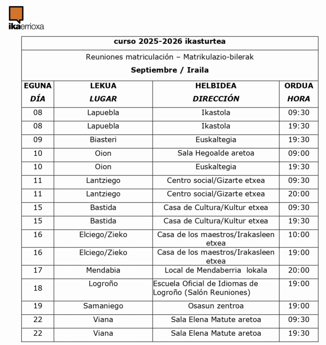 Un inicio de curso cuyo periodo de matriculación para los cursos de euskera 2025/2026, se ha iniciado esta misma semana 1 y concluirá el 22 de septiembre, en los euskaltegis de Rioja Alavesa. Esta iniciativa busca fomentar el aprendizaje y la práctica del euskera entre personas de todas las edades, ofreciendo programas para aprender a hablar, leer y escribir, mejorar el nivel o lograr titulaciones oficiales reconocidas por HABE.