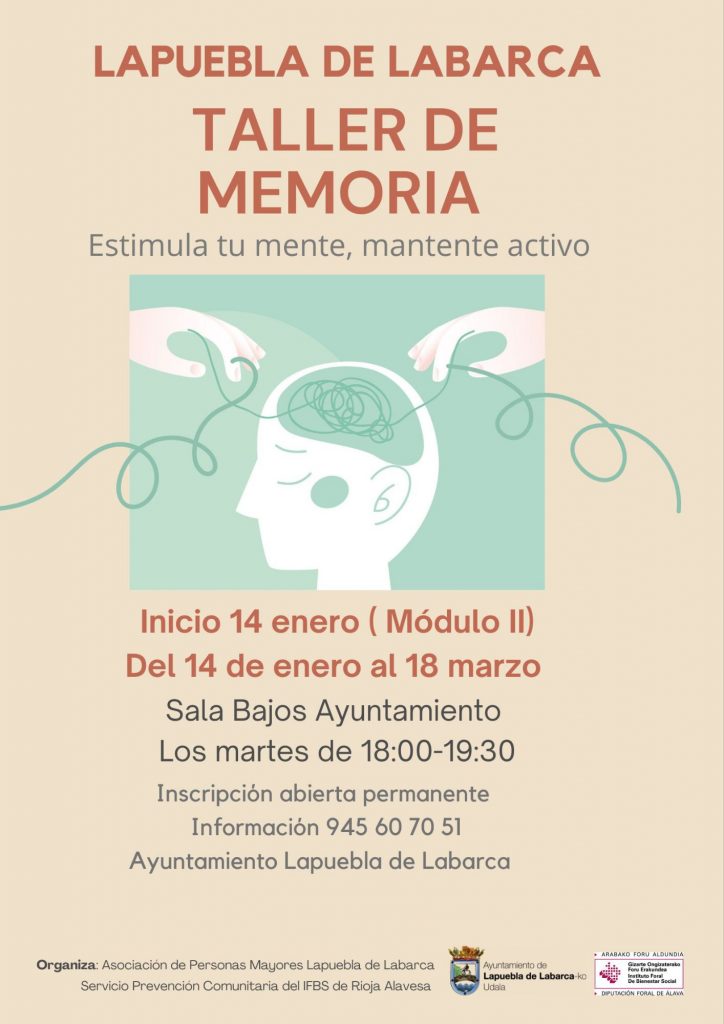 No podemos por último olvidarnos de Lapuebla de Labarca, donde próximamente se llevará a cabo el segundo módulo del Taller de Memoria, también en colaboración con la Asociación de Personas Mayores y el Ayuntamiento. Este taller es una continuación de la primera parte, lo que significa que los participantes podrán seguir avanzando en su aprendizaje y, a la vez, disfrutar de un espacio social enriquecedor.Estos talleres son una excelente oportunidad para mejorar la calidad de vida de nuestros mayores. La participación es gratuita y abierta a toda la población.