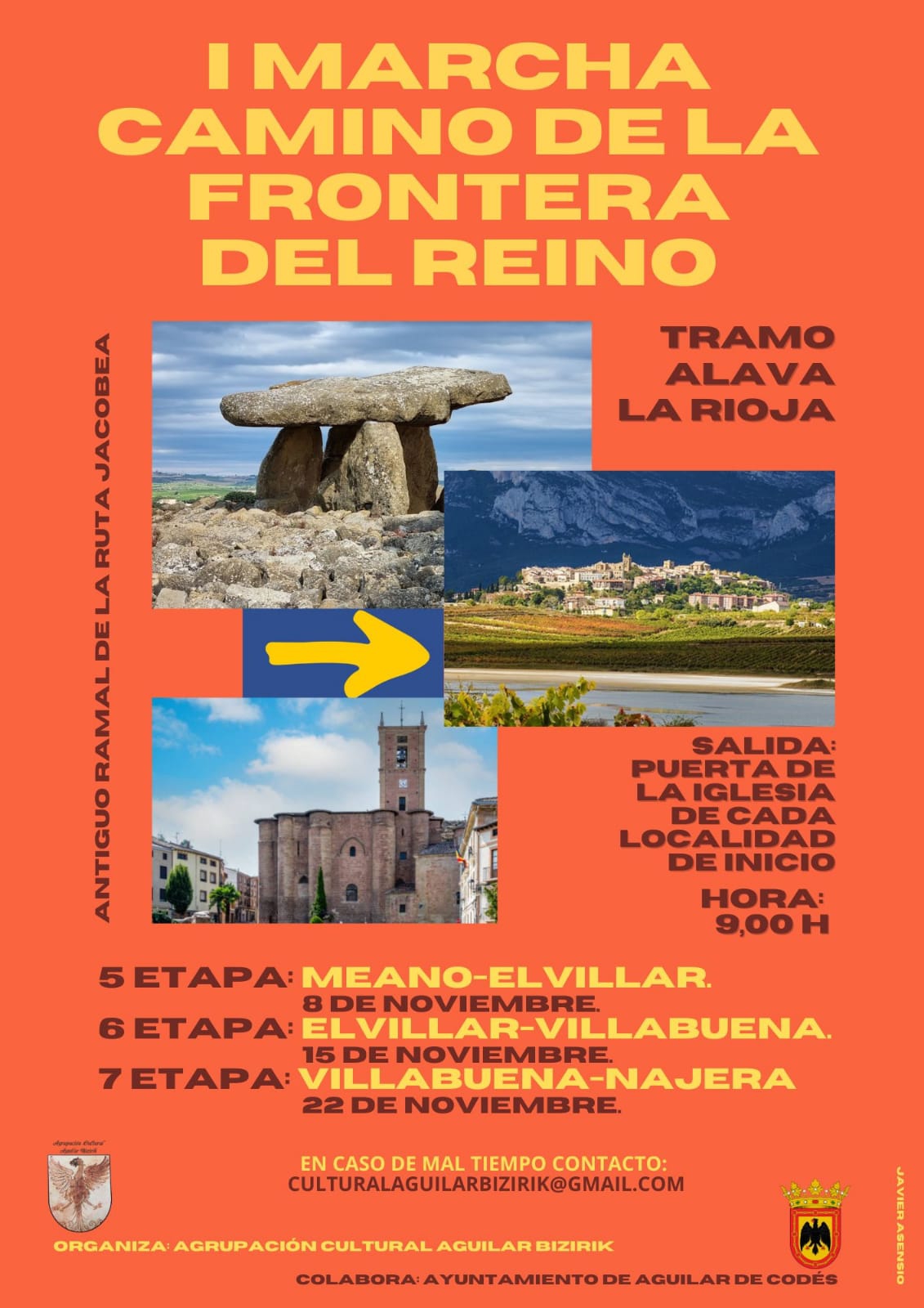 Las próximas etapas serán las siguientes: la 5ª, de Meano a Elvillar el 8 de noviembre; la 6ª, de Elvillar a Villabuena el 15 de noviembre; y la 7ª, de Villabuena a Nájera el 22 de noviembre. Todas comienzan a las 9:00 horas desde la puerta de la iglesia de la localidad de salida. En caso de mal tiempo, nos añaden tan sólo cabe consultar el correo culturalaguilarbizirik@gmail.com.