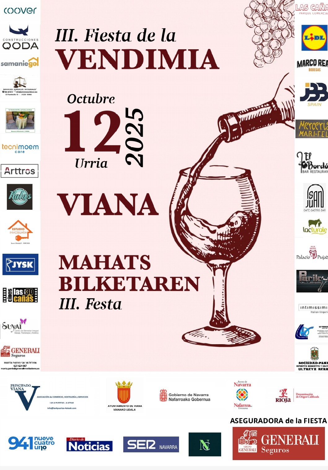 Mañana domingo 12 de octubre, Viana se vestirá de fiesta para celebrar la tercera edición de su Fiesta de la Vendimia, un evento que rinde tributo a la tradición vinÃcola y al espÃritu comunitario. Organizada por la Asociación de Comercio, HostelerÃa y Servicios de Viana en colaboración con el Ayuntamiento, la jornada se centrará en la Plaza de los Fueros con actividades para todos los públicos.