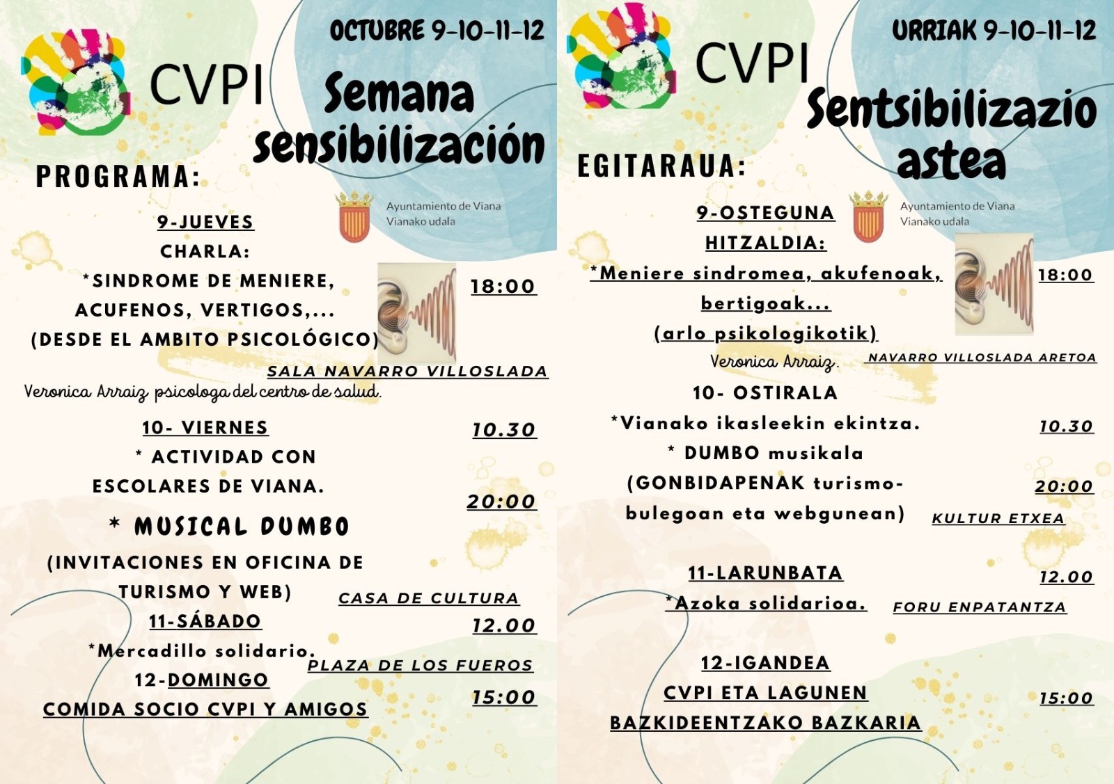 La semana arrancará este jueves 9 de octubre a las 18:00 en la Sala Navarro Villoslada con una charla sobre el «Síndrome de Ménière, acúfenos y vértigos» desde una perspectiva psicológica, impartida por la psicóloga del centro, Verónica Arraiz. El viernes 10, a las 10:30, los escolares de Viana participarán en una actividad educativa para fomentar la empatía y el respeto hacia la diversidad. Esa misma tarde, a las 20:00, la Casa de Cultura acogerá el musical “Dumbo”, una propuesta inclusiva (entradas disponibles en la oficina de turismo y en su web).